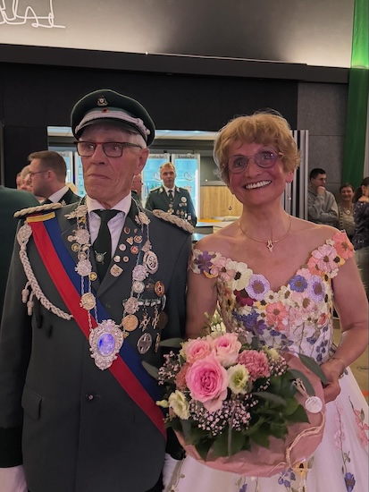 Als Zeichen des Dankes überreichte die Altenbekener Königin Gertrud Remmelmann den anwesenden Majestäten der befreundeten Bruderschaften jeweils einen Blumenstrauß. Über diese Aufmerksamkeit durften sich Alois und Anke Plückebaum aus Kempen, Friedolin und Mathilde Schäfers aus Feldrom, Yvonne Goeken aus Schwaney in Begleitung des vertretenden Obersts Julian Wiethaup sowie Andreas und Claudia Bertelt aus Buke freuen.