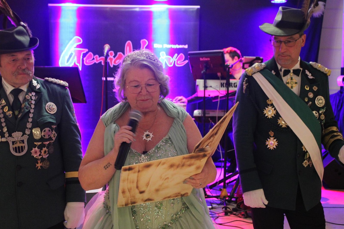 Anschließend richtete Königin Gertrud Remmelmann herzliche Worte an die Gäste des Königinnenballs in der Eggelandhalle. Dabei sprach sie allen Helferinnen und Helfern des Abends ebenso ihren aufrichtigen Dank aus wie den vielen Unterstützerinnen und Unterstützern, die sie und König Heinrich seit Beginn des Regentschaftsjahres begleitet haben. Mit dem beim Königschießen zunächst nicht erwarteten Königsschuss ihres Lebensgefährten Heinrich habe eine ganz besondere und in vielerlei Hinsicht bewegende Zeit begonnen. Das vergangene halbe Jahr, so betonte sie, werde nicht nur ihr und Heinrich, sondern auch dem gesamten Hofstaat in besonders schöner Erinnerung bleiben.