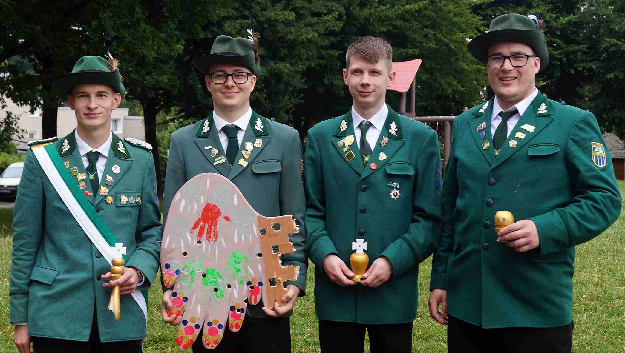Auch die Jungschützen ermittelten ihre neuen Titelträger. Neuer Jungschützenkönig 2025 wurde mit dem 118. Schuss Andreas Küting (2.v.l.) aus der Bollerborn Kompanie. Neuer Kronprinz wurde Arne Grewing (2.v.r.) aus der Schweizer Kompanie und neuer Apfelprinz Martin Bussen (r.), von der Westkompanie angehören. Mit dem Jungschützenmeister Daniel Schlichting (l.) stellt die Bollerborn Kompanie auch den Jungschützenzepterprinz.